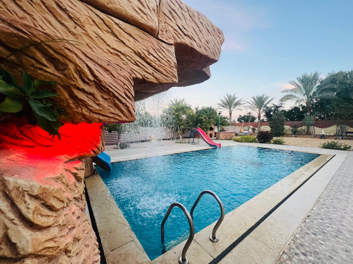 Probudite se uz pogled koji oduzima dah na drevne piramide Abusir ispred vas. Predivna vila sa 5 spavaćih soba, gostinjskom kućom, bazenom, bujnom baštom, teretanom, igraonicom i kućicom na drvetu. Za 10 osoba. Dizajnirao nagrađivani arhitekta Ahmad Hamid (Svjetska nagrada za arhitekturu 2010), inspirisan Hasanom Fatijem. 20 minuta do piramida u Gizi i Velikog egipatskog muzeja. Umetnička kolekcija koju je lično odabrao vlasnik Taja Elzajadi. Možete da unajmite privatnog kuvara. Mirno utočište pogodno za porodice u kojem se susreću istorija, umetnost i luksuz.