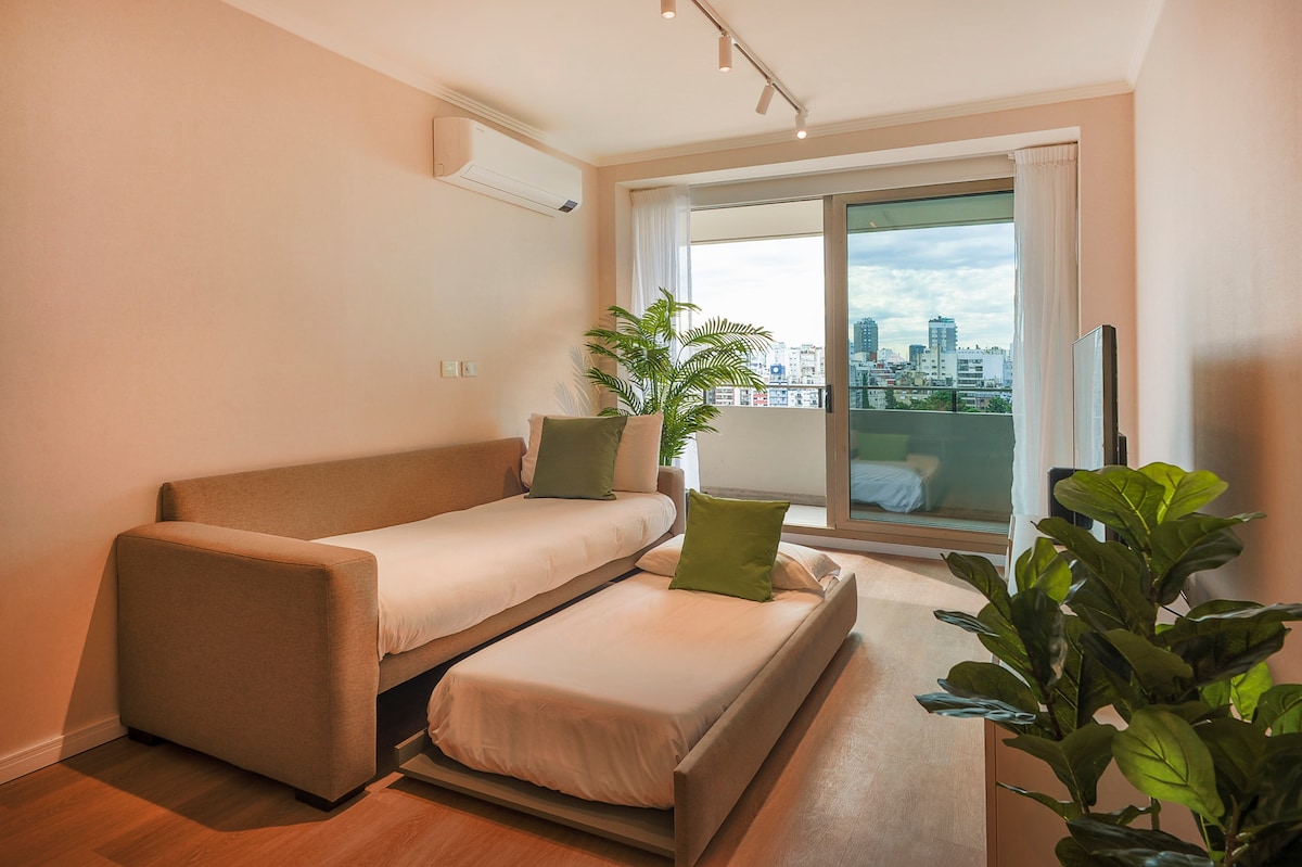 Potpuno novi studio apartman sa kitchinetteom, kupatilom i balkonom sa sjajnim pogledom u srcu Rekolete. Kul moderna dekoracija, kompletno opremljena i bezbedna. SmartTV sa kablovskom i Netflix-om (prijavite se sa svojim nalogom). Zgrada sa odličnim sadržajima: grijani unutrašnji bazen, spoljni bazen sa solarijumom, spa sa sobom za masažu i saunom i teretana. Do najboljih restorana, barova i kafića, kao i do autobuske i metro stanice.