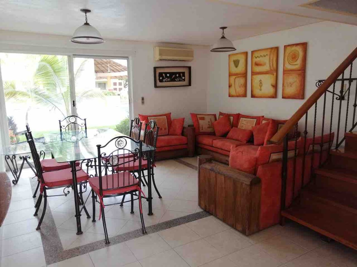 CASA COMPLETA EN VILLAS TERRASOL ACAPULCO DIAMANTE en zona residencial de 160 m2, en 2 niveles más roof top, cocina, 3 recámaras con aires acondicionados y mosquiteros, 2 baños completos, área de lavado, 2 estacionamientos, seguridad 24 hrs Los huéspedes llevan sus artículos de higiene personales. Se deja una toalla blanca por huésped SOLO 6 HUÉSPEDES A PARTIR DE LA 7a PERSONA SE COBRA CADA DÍA COMO UNA NOCHE EXTRA ¡YA HAY CANCHA DE PADEL! Continúan reparaciones por daños huracán John