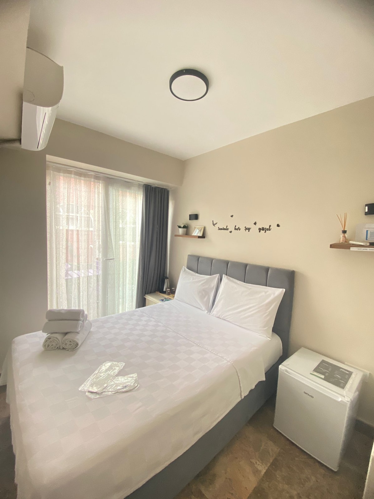Naša soba s visokim plafonom, koja se nalazi na srednjem spratu naše vile, ima balkon s djelimičnim pogledom na more. Ova privatna soba, u kojoj se možete probuditi uz jedinstveni pogled na more, grad i ostrvo, čeka da vas, vaše cijenjene goste, provedete u mirnom i udobnom boravku.