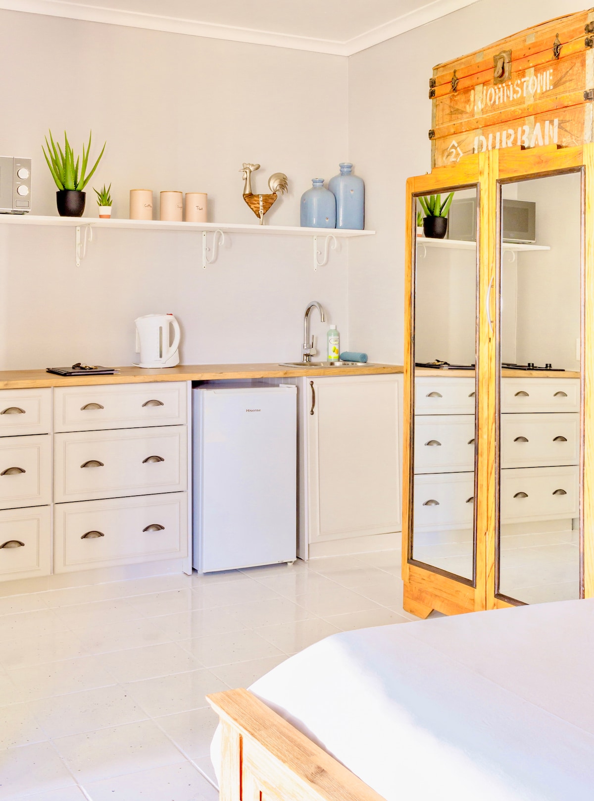 Air-conditioned deluxe Family room with one King bed and an interleading room with two single beds - suitable for a family of 4. En-suite bathroom with shower only. Kitchen with fridge and microwave and fully equipped for self- catering, Braai area in garden. Private entrance and patio. Breakfast is available at R130 per person. We offer game drives to the Addo Elephant Park as well as to private game reserves.