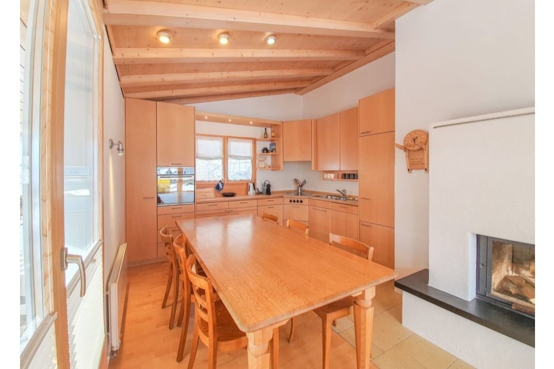 Chalet Thüler ground floor left. Centrally located, 150m above the bus station and 150m next to the Tschentenalp basestation. Very quiet with breathtaking mountain view. Ideal starting point for skiing and hiking activities. 150m from village center with many shops and restaurants. Modern standard. Bedroom 1: double bed and bunk bed (4 pers.). Sofa bed in the living room (2 pers.). Garage space for 1 car.