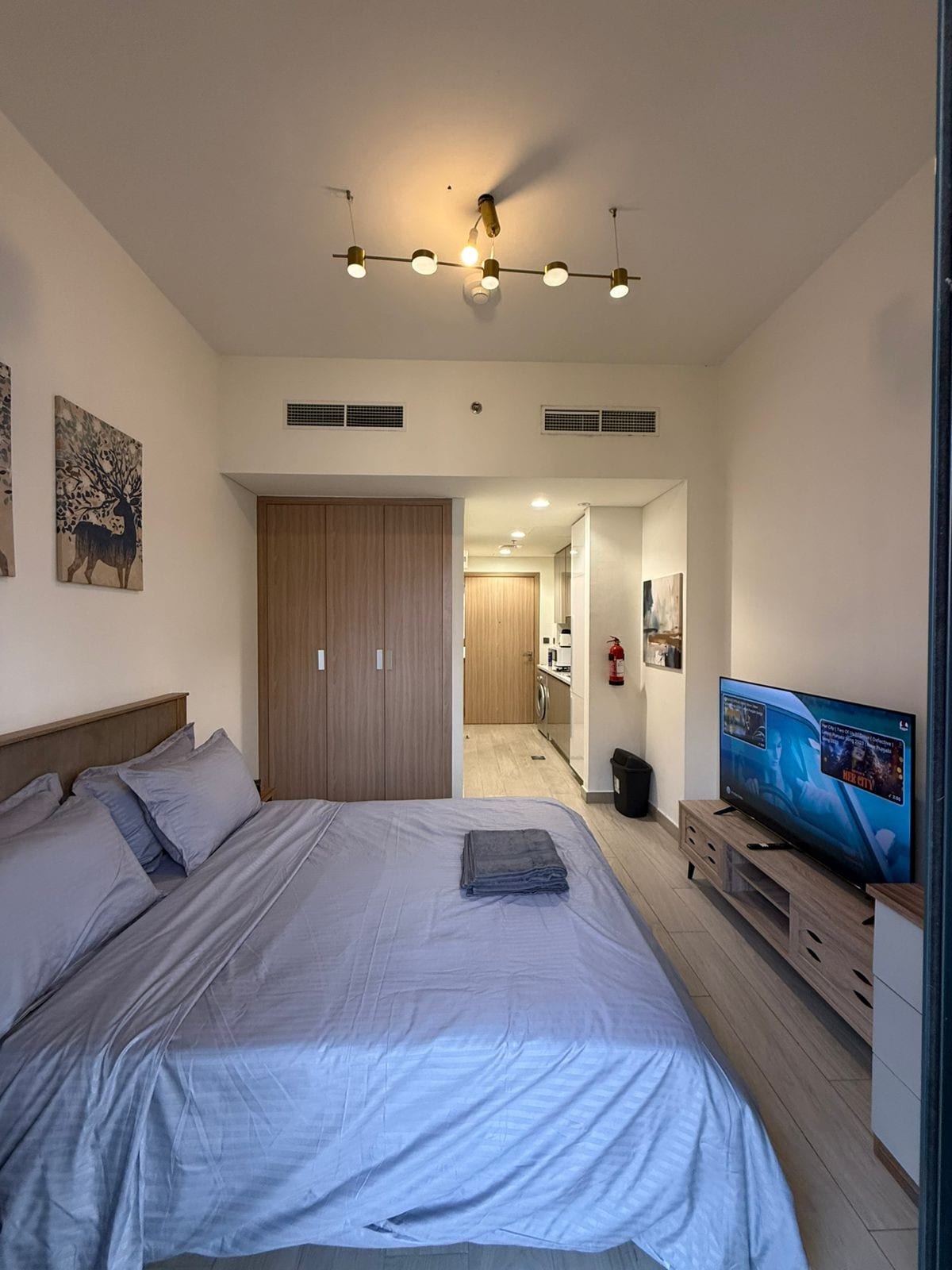 Ovaj elegantni studio apartman, koji se nalazi u novoizgrađenom tornju u srcu grada, nudi novi i moderan namještaj za udoban boravak. Uživajte u pogledu na horizont kroz velike prozore i pripremite omiljena jela u potpuno opremljenoj kuhinji. Bezbjednost je zagarantovana non-stop, što vam omogućava da se opustite bez brige. Samo nekoliko koraka od atrakcija, restorana i tržnih centara, ovaj studio je savršena baza za istraživanje Dubaija. Rezervišite odmah