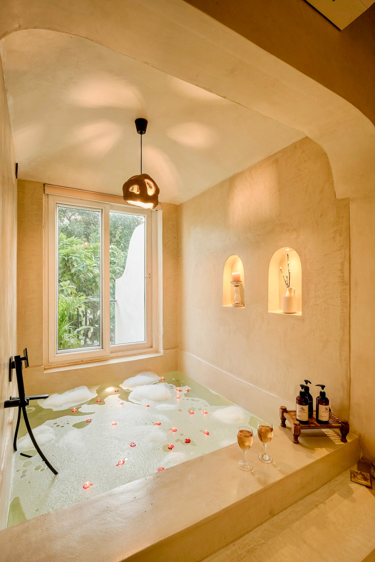 Kanso by Earthen Window je tihi 1BHK u Siolimu, oblikovan oko zemlje, svetlosti i privatnosti. Dizajnirani za spora jutra i večeri bez žurbe, enterijer je urađen sa zidovima premazanim krečom, mekim podovima od mikrobetona i pažljivo odabranim predmetima koji mu daju šarm vile. Spavaća soba se otvara ka PRIVATNOJ BAŠTI NA TERASI i izolovanoj hidromasažnoj kadi od mikrobetona sa ĐAKUZIJEM, obe sa pogledom na neprekidnu zelenu šumu. Zajednički sadržaji uključuju bazen, parnu sobu, teretanu i obezbeđenje 24×7.