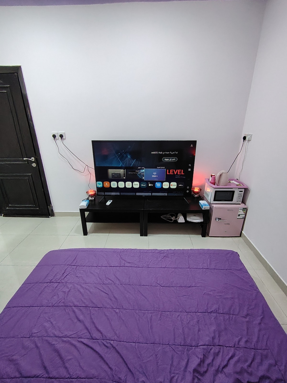 استديو بمدخل مستقل بسرير ماستر بشاشة نظام LG ماجيك ريموت ماوس بمقاس 85 مع ريموت إضافي وركن ثلاجة معبأة بالمياه وغلاية متنوعة من الشاي والقهوة ومايكروويف وحماصة ساندويتش وغسالة وكواية وأستشوار ودورة مياه خاصة بها