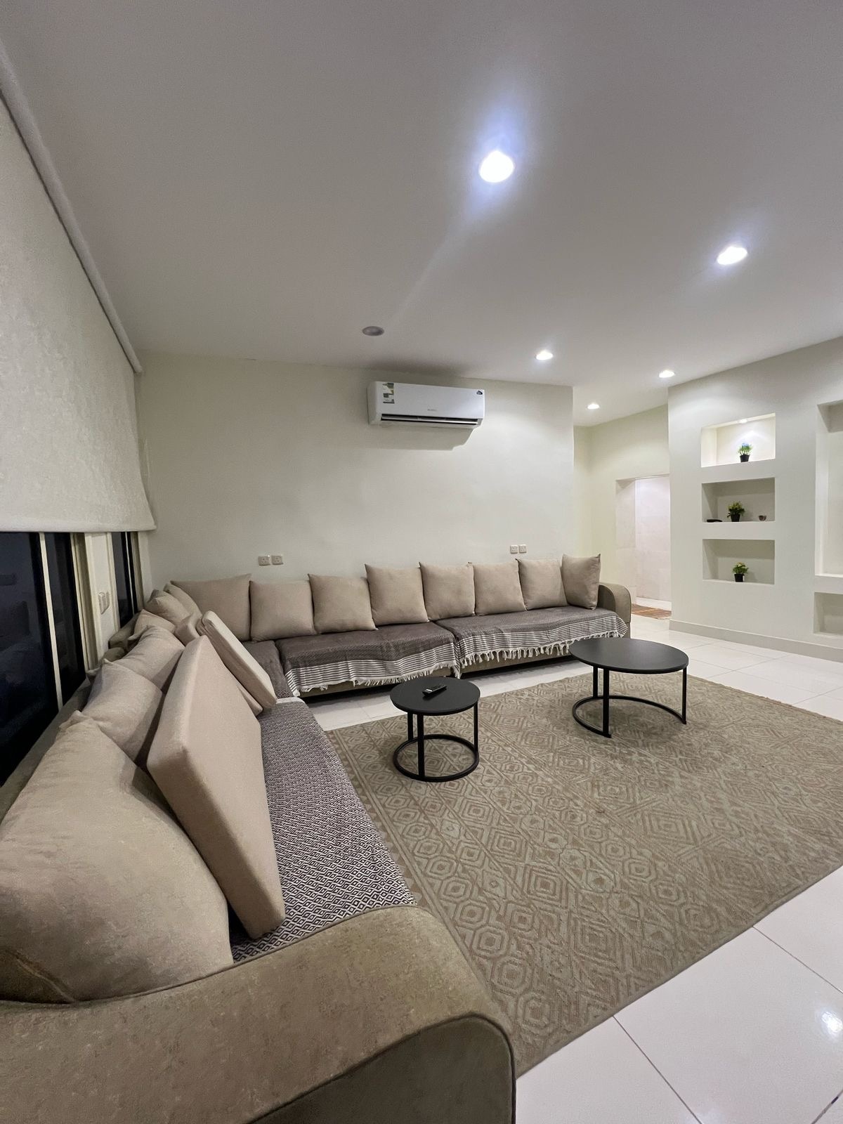 شقة أنيقة بتصميم عصري وألوان هادئة تتميز بصالة واسعة وكنب مريّح للاسترخاء يمنح المكان الراحة والفخامه