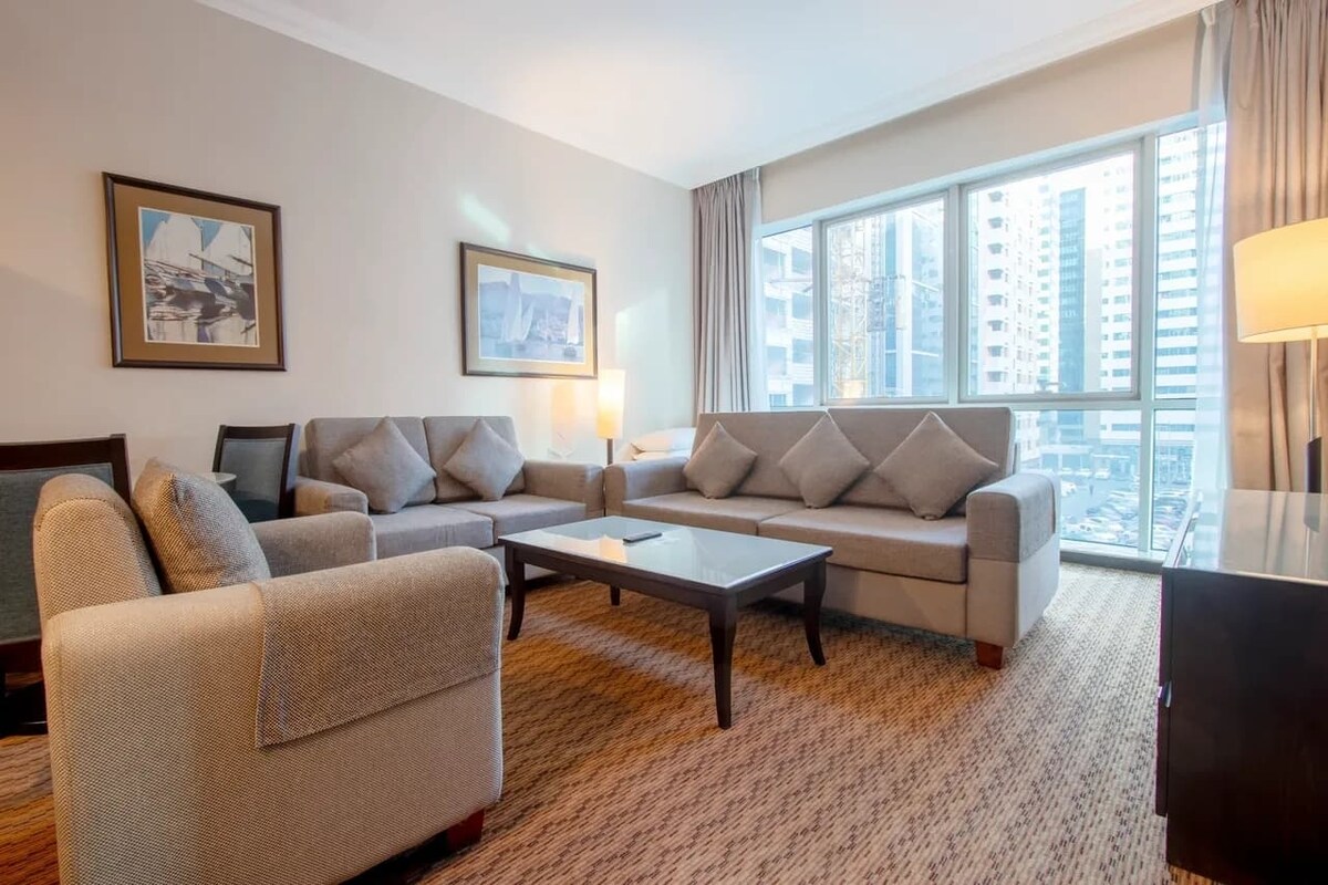 Ovo moderno utočište nudi bračni krevet, udoban kauč na razvlačenje (savršen za najviše 2 dodatna gosta), potpuno opremljenu kuhinju, pametni TV, Wi-Fi, mašinu za pranje/sušenje veša i privatni balkon s pogledom na Zaliv. - Uživajte u privatnom pristupu plaži, 3 bazena, 2 teretane, mini fudbalskom terenu, prostoru za djecu i besplatnom parkingu. - Koraci od Carrefour-a, Yas Marina Circuit. - 5-10 minuta do Ferrari svijeta, tržnog centra Yas i još mnogo toga. - 7 minuta do aerodroma, 25 minuta do centra grada. - Povoljan luksuz sa danonoćnim obezbjeđenjem. Rezervišite sada za živopisan boravak na ostrvu Jas!
