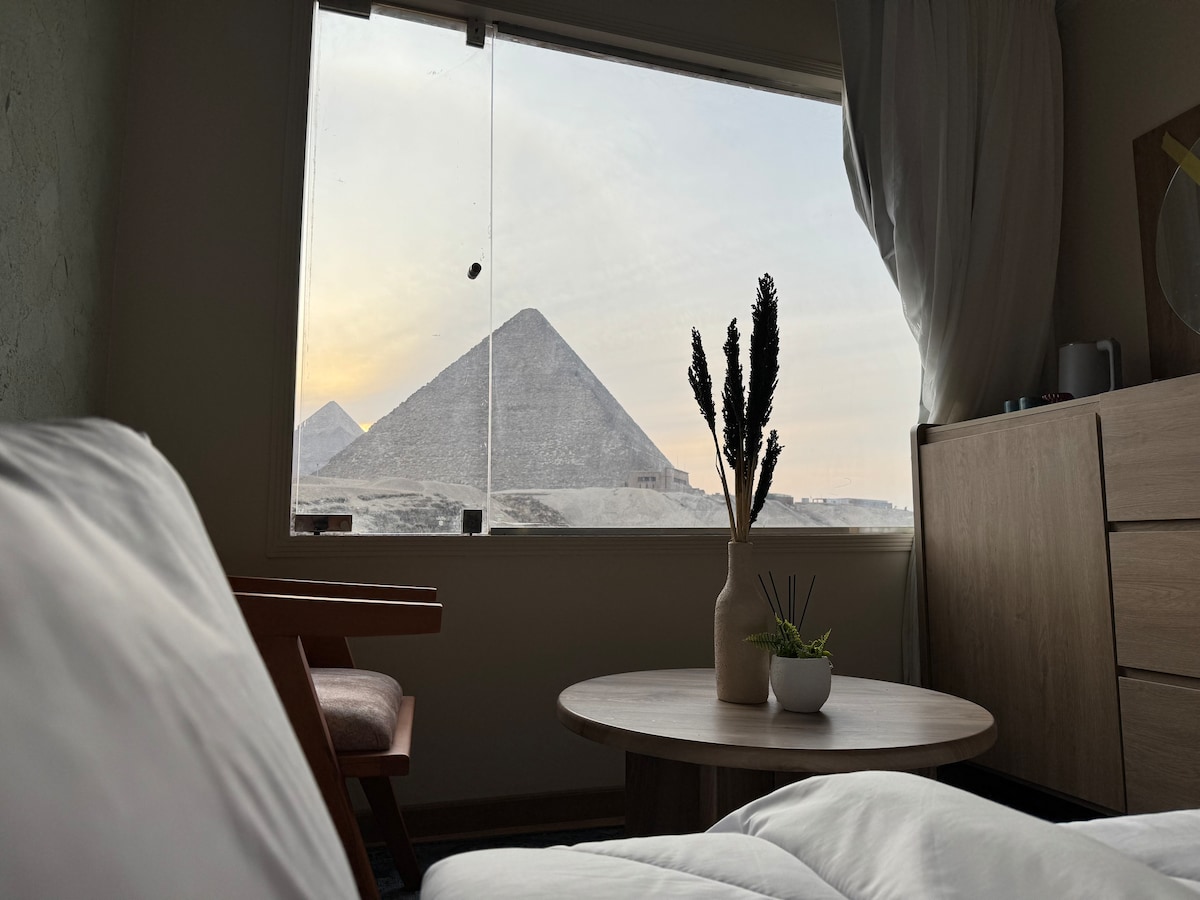 Relax in this calm, beautifully designed room overlooking the Pyramids. Enjoy soft natural light, warm minimalist interiors, and a peaceful atmosphere perfect for unwinding. Guests also have access to our rooftop, offering an uninterrupted panoramic view of the Pyramids — the ideal spot for sunrise, sunset, and unforgettable moments.