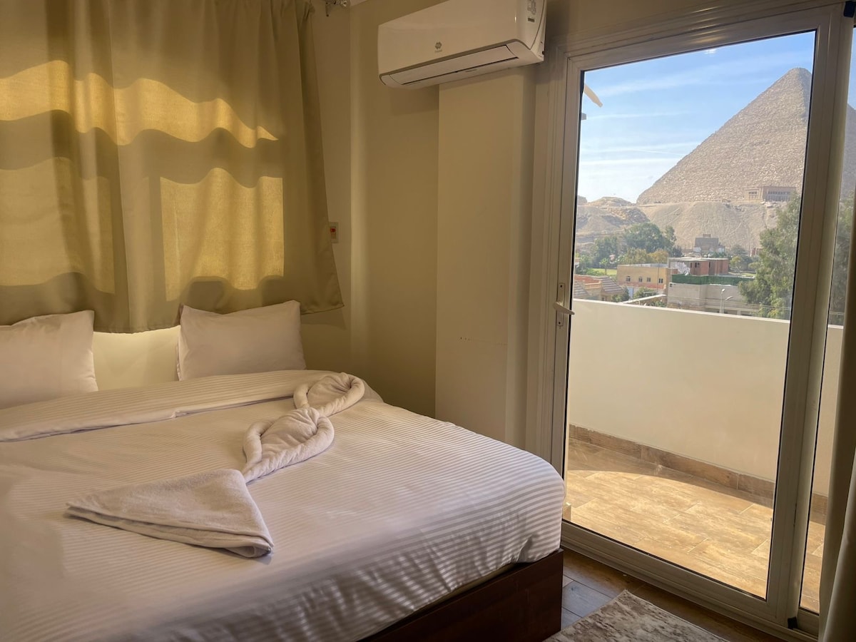 Ovaj stan se nalazi na samo 5 minuta hoda od ulazne kapije Sfinge i piramida sa pogledom na piramide sa balkona , nalazi se na mirnoj lokaciji u blizini mnogih restorana, prodavnica, prodavnica voća, prodavnica (lokalnih i turističkih), mini pijaca i apoteka, stan je klimatizovan, neograničen brz internet , čiste čaršave, čiste peškire i mirnu atmosferu. To je vjerovatno najbolje mjesto za uživanje u pogledu na piramide