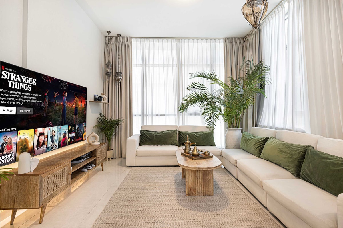 Experience a unique cultural retreat in The Polo Residence, Meydan City, just 10-15 minutes from Burj Khalifa. This 1-bedroom apartment blends ancient Arabic design with modern comfort, featuring handmade mango wood furniture, lush greenery, and thoughtful regional details. Enjoy Arabic coffee, henna art, or vinyl records on the turntable. With a king-size bedroom, cozy sofa, fast Wi-Fi, and premium streaming, it’s the perfect blend of authenticity, peace, and proximity to downtown Dubai.