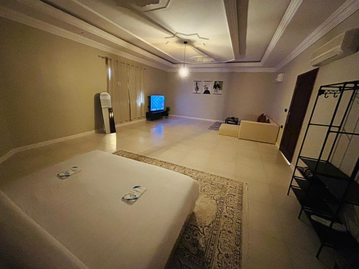 Uživajte u sjajnom putovanju u ovom posebnom domu. Ovaj privatni dom nalazi se u blizini Prorokove džamije i džamije Kuba, udaljen svega 5 minuta vožnje automobilom. Sve osnovne usluge i poznati popularni restorani u Medini dostupni su u blizini doma. Ovaj smještaj sadrži : - Prostrana spavaća soba sa udobnim bračnim krevetom. - Pametni ekran od 65inča - Mini bar sa električnim kuvalom za vodu, mikrotalasnom pećnicom, frižiderom - Kupatilo sa svim dodacima - brzi WiFi - Lift