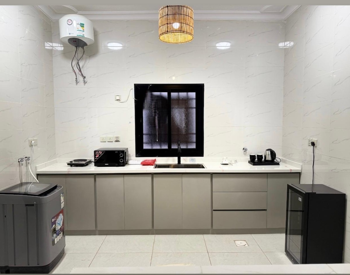 Prepoznatljiv stan sa modernim dizajnom i najnovijim dizajnom i najboljom udobnošću. Veoma nam je stalo do klijenta u pogledu dnevne čistoće i sterilizacije, profesionalne službe za korisnike (ponosni smo na evaluaciju naših klijenata Alali Lina) Sadrži: Bračni krevet (širine 180-179 cm) i udoban krevet za jednu osobu. Kuhinja - Mikrotalasna rerna - Frižider - Čajnik - Mašina za veš Toalet. Uredan dizajn i udoban prostor. Brzina interneta 250 Mbps Samostalni ulazak Parking Važna lokacija u blizini restorana, tržnih centara Poslanikova džamija🕌: 5-7 minuta🚗 Aerodrom✈️ : 11 minuta 🚗 Voz Haramein🚆: 7 minuta 🚗 I 24-satnu uslugu za savršen i miran boravak.