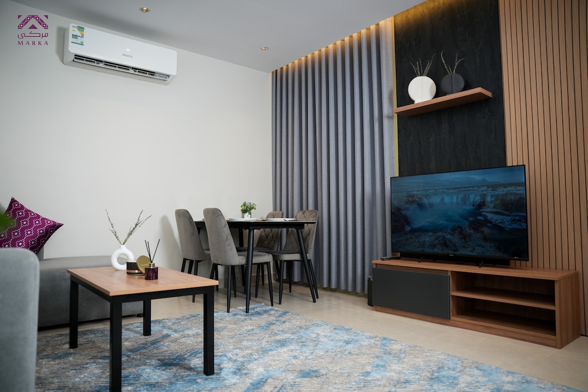 Uživajte u savršenom boravku u elegantnom stanu koji kombinuje udobnost i privatnost, koji se sastoji od mirne spavaće sobe i elegantnog i pažljivo opremljenog dnevnog boravka. Smještaj je pogodan za male ili srednje porodice i ima udobnu atmosferu, visoku čistoću, praktičan i elegantan namještaj. Izaberite ovu jedinicu ako tražite elegantan hotelski smještaj u mirnom i bezbjednom okruženju, u blizini svega što vam je potrebno. Karakteristike : U blizini tržnog centra Al Rashed mega, minut hoda. U blizini autobusa za putovanje do Poslanikove džamije 3 minuta hoda.