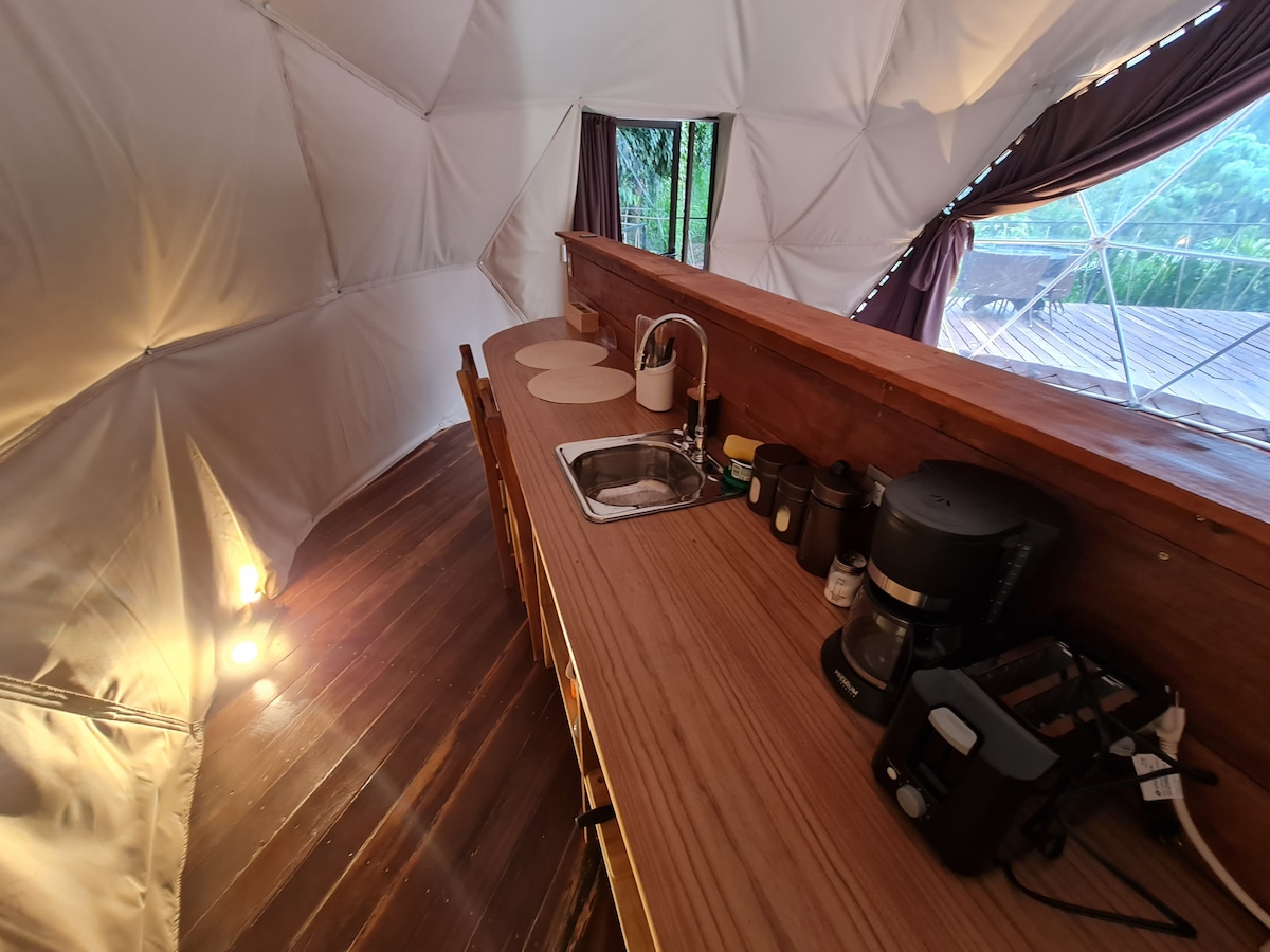 Uronite u bujno zelenilo prirode i zadivljujućih pogleda , prebacite se u jedinstven doživljaj boravka u ovoj luksuznoj glamperskoj kupoli koja se nalazi na samo 35 minuta od SJO aerodroma i grada Alajuela, 5 minuta od farme kafe Hacijenda Alsacia Starbucks i minuta od vodopada La Paz Gardens i Poas Volcano. Ova jedinstvena kupola ima sve što vam treba, od bračnog kreveta do toplih tuševa, čajne kuhinje, terase i još mnogo toga.