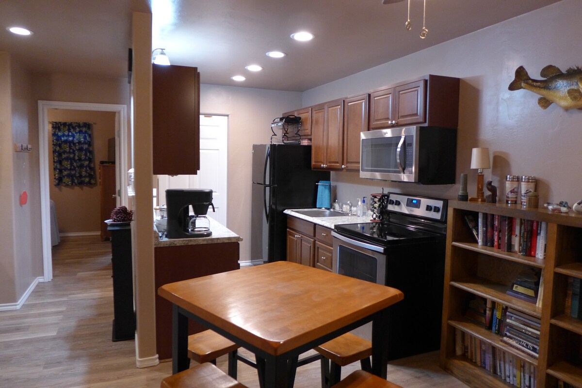 Odmorite se od svakodnevnice u našem udobnom domu s 3 spavaće sobe koji se nalazi na 4 hektara zemlje. Može da primi osmoro osoba, uključujući djecu. Prikladno za porodice sa privatnim jezerom u pozadini. Idite na pecanje, igrajte igre na terasi, pa čak i kuvajte uz naš roštilj na terasi. Ili ostanite unutra i iskoristite našu najsavremeniju kuhinju za prijatnu večeru sa porodicom. Mi smo takođe udaljeni oko 5 minuta vožnje od jezera Fork.