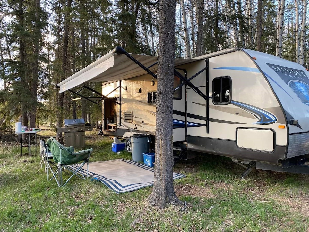 Wake up to birds chirping and reconnect with nature in the heart of the Robson Valley. Have your morning coffee with horses outside your window. World famous Mount Robson is only minutes away. Spend the day hiking/rafting/bird watching or biking, and come home to a big kitchen, cosy bed, hot shower, and air conditioning! The camper is very spacious, and has all you need - towels, dishes, WIFI, even boardgames, books, and DVDs. After your day of adventure, relax and unwind in a private sauna.