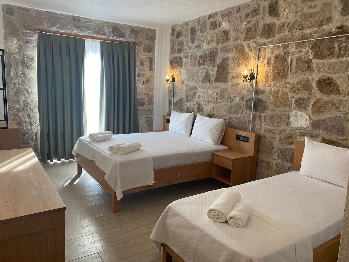 NALAZIMO SE U CENTRU AJVALIKA, 2 MINUTA HODA DO BAZARA. 3. sprat istorijske vile s rumom u Ayvalıku Naša kamena soba na podu. Dok stižete ovdje, dolazite iz istorijskih uskih ulica Ajvalika, uživajući u vazduhu od ruma. Ova soba ima 2 odvojena kreveta za jednu osobu ( dodatni kreveti se mogu spojiti) i jedan kauč na razvlačenje. Otvaranje sofe može da primi 1 odraslu osobu ili 2 djece. Imamo zajedničku terasu sa veličanstvenim pogledom na Ajvalik.