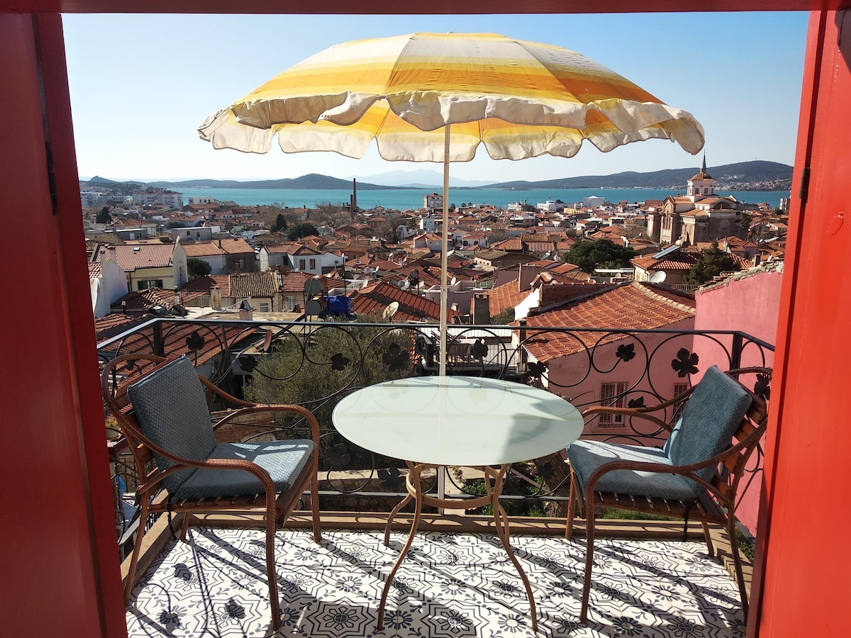 10 minuta hoda do trga Ayvalik, možete stići do Cundaya Sarimsakliya za 10/15 minuta automobilom. Divna trospratna kamena grčka kuća sa baštom i veličanstvenim pogledom na more. kuhinja u prizemlju. dnevni boravak. toalet srednji sprat 1 krevet za jednu osobu 1 bračni krevet, garderoba, kupatilo, toalet na gornjem spratu, grupa za sjedenje na terasi sa veličanstvenim pogledom na more, 1 bračni krevet i fotelja. U bašti se nalaze stablo limuna i masline. Čišćenje je veoma važno. Možete da idete automobilom ispred kuće, ali možete da parkirate u gornjoj ulici.