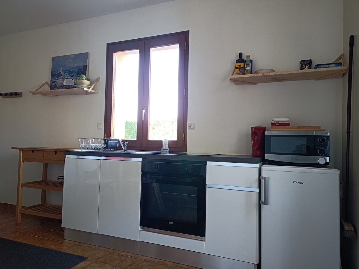 🏡The refinement of a suite, the intimacy of home. Escape to a peaceful retreat in a one-bedroom apartment with a terrace. Living area: cozy living room with kitchenette and sofa bed (140x200 cm). Sleeping area: bedroom (160x200 cm bed) with a desk. Amenities: breakfast, private entrance, linens, local toiletries, Wi-Fi & Netflix. The vibe: Stroll in the garden or enjoy our games, reading material, or suggestions for outings. The extra touch: Our brunch, picnic, or dinner options
