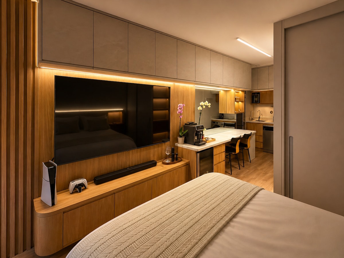 Studio 40011: 4 min. od parka Alijanc. Kompaktan, moderan, kompletan i udoban studio u jednom od najkulturnijih regiona Sao Paula. 📍 Okruženi kafićima, restoranima i predstavama. Ovdje grad pulsira ✨ Udoban krevet, radna površina, ormar, klima-uređaj, TV i kuhinja opremljena aparatom za sendviče, fritezom, aparatom za kafu, šporetom, frižiderom. Privatno 🚿 kupatilo i udobna rasvjeta. Uz tu atmosferu „Želim da ostanem malo duže” Savršeno za uživanje, odmor ili rad. Rezervišite odmah!