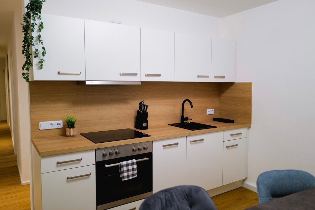 Das Appartement hat einen eigenen Eingang. Über den Treppenabgang kommt man ins Souterrain mit Vorraum und Garderobe. Im ersten Raum befindet sich die Wohnküche mit Sitzcouch und Tisch, Küchenzeile und TV. Durch einen offenen Durchgang kommt man in das Schlafzimmer mit Kleiderschrank, Bett 1,40 cm breit und Schreibtisch. Im Anschluss befindet sich die Schiebetür zur Dusche mit WC.