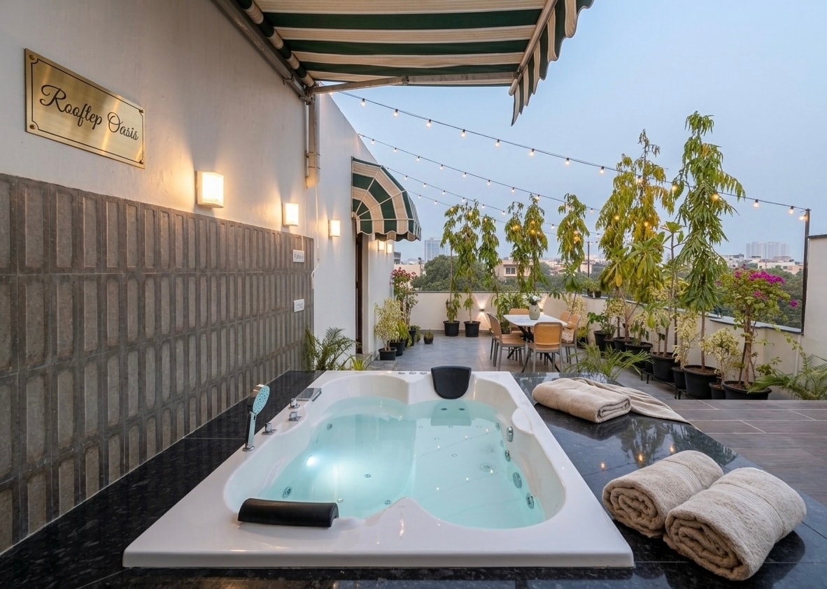 • H13/ HEPA prečišćivači vazduha za prostorije • Svakodnevno čišćenje i čisti peškiri • Domar od 10:30 do 19:00 • Smart TV sa Netflix-om, Amazon Prime-om itd. • Brzi Wi-Fi • 5–7 minuta od ulice Mehrauli Fashion (najbolji noćni život u Delhiju) i tržnog centra Saket Citywalk • 5 minuta od metroa u Delhiju Dobro došli na onnyxrooftop Organizovao sam luksuzno iskustvo u Južnom Delhiju, Centralni NCR. Uživajte u luksuznim spavaćim sobama, izuzetnom dnevnom boravku i privatnom salonu na krovu sa đakuzijem i barom.