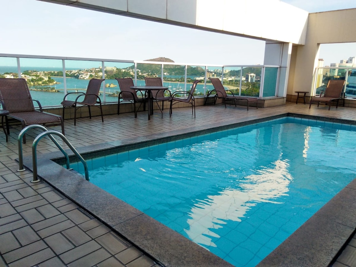 Apart (flat) com 30m2, aconchegante todo climatizado com 2 aparelhos tipo split, no coração da praia do canto. A poucos metros dos melhores bares, restaurantes, farmácia, supermercado e da melhor praia. Tudo pode ser feito a pé. Varanda com vista p o mar. O espaço tem uma suite, saleta com sofá retrátil e TV plana. Mini cozinha. Sua comodidade em melhor estilo. Excelente café da manhã é oferecido no local(cobrado a parte), e arrumação é diária e gratuita. Venha curtir esta experiência!