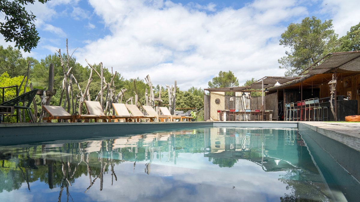 For a romantic weekend getaway, unwind beneath the pines, lulled by the song of the cicadas. Stay in a private lodge with a cozy sleeping area, your own swimming pool, and a summer kitchen—perfect for a starlit dinner for two. Hand-in-hand walks, quiet reading in the shade, naps by the water… everything here invites you to relax and reconnect, just 15 minutes from Nîmes and close to Sommières.