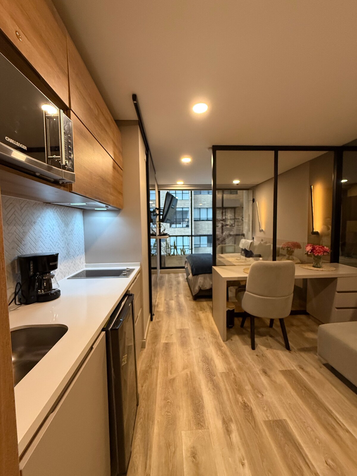 🌆 This accommodation is located in Quinta Camacho, a bohemian and vibrant neighborhood. 🌇 Enjoy the view from the 15th floor balcony and explore nearby restaurants and bars. 🛋️ Quiet and comfortable space to relax. Ideal for couples and solo travelers. 🏙️ 15th floor with spectacular views 🛏️ High-quality hotel-grade mattress 📺 65” TV with Netflix, Prime Video, and Disney+ 🏊 Swimming pool (reservation required), cardio area, game room 🚶 Steps away from Zona T and the financial dist