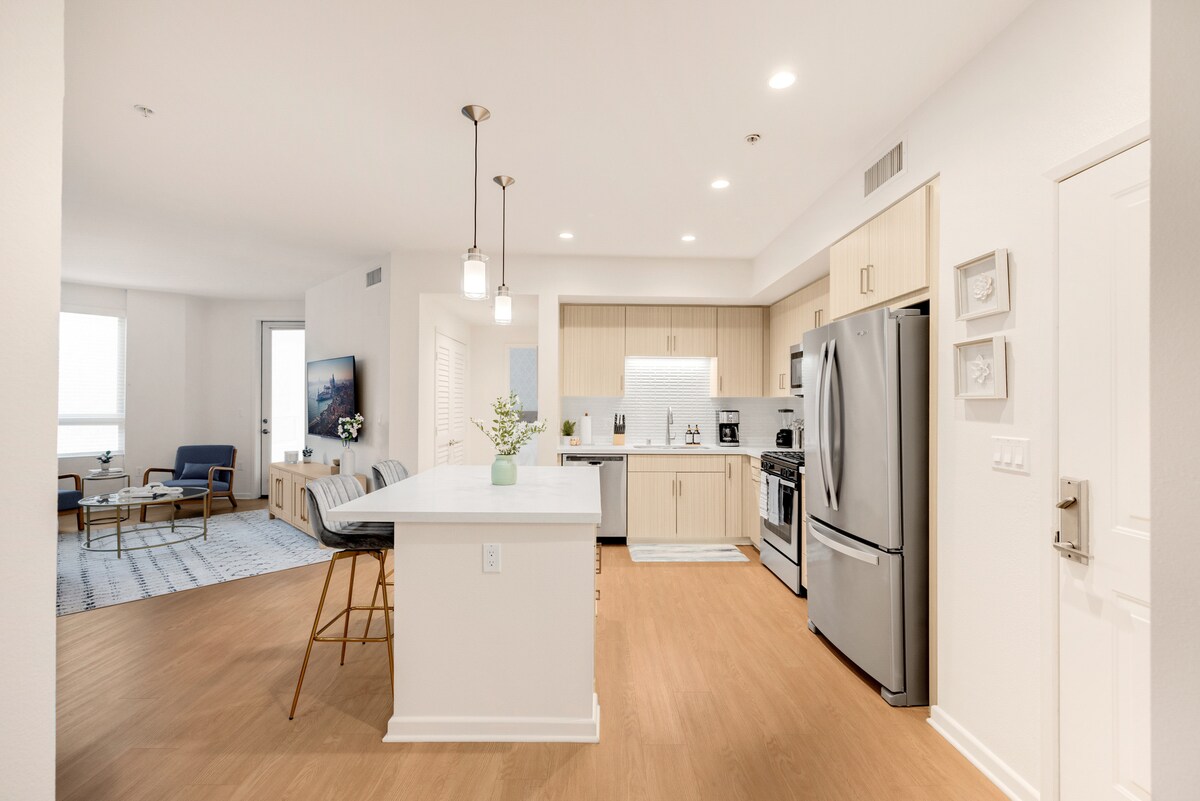 Uživajte u životu u našem visokom stanu, sa zadivljujućim zalaskom sunca i pogledom na grad sa balkona. Idealno za parove, porodice, radnike na daljinu i grupe. Nalazi se u srcu okruga Orindž, nekoliko minuta od aerodroma Džon Vejn, luksuzne kupovine i večere. Naše utočište je preplavljeno prirodnim svjetlom, a profesionalna kuhinja se može pohvaliti vrhunskim aparatima od nerđajućeg čelika. Povećajte svoje SoCal iskustvo sa stilom i udobnošću. Vaše luksuzno utočište vas čeka!