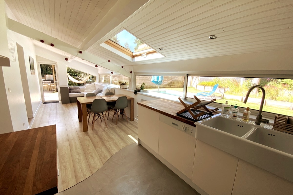 Linge de maison (lits faits) et ménage compris. Bienvenue dans notre villa contemporaine de 110 m², classée 4 étoiles, climatisée, avec piscine au sel chauffée. Nichée dans un écrin de verdure, dans le secteur Hossegor, Seignosse. Idéale pour des vacances en famille ou entre amis. Vous serez accueillis par Catherine de la Conciergerie de l'Etang Blanc qui sera disponible si besoin tout le long de votre séjour. Heures d'arrivée et de départ flexibles hors juillet/août, n'hésitez pas à demander.