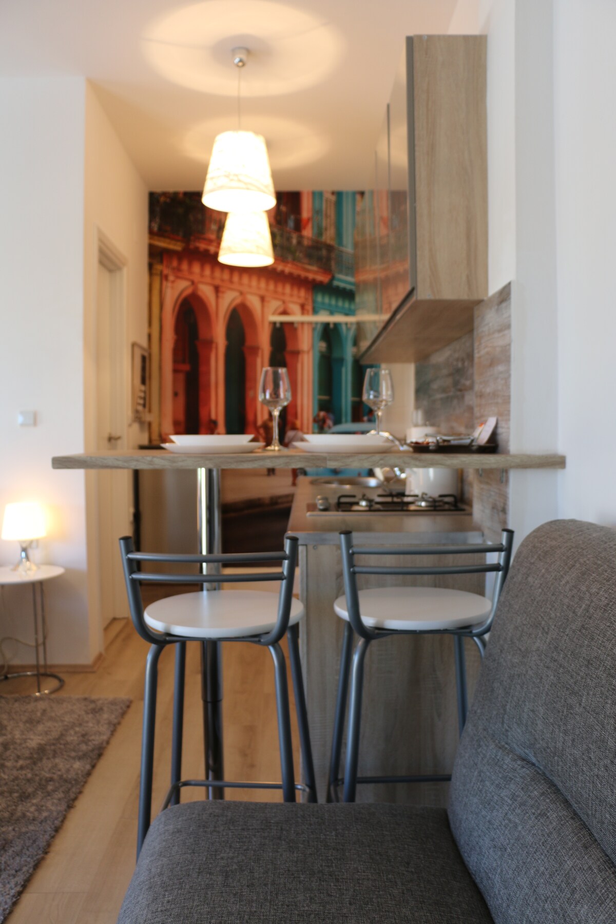 Ovaj jedinstveni smještaj uređen je u nesvakidašnjem stilu. Studio-apartman se sastoji od prostora kuhinje sa blagavaonicom i prostora sa krevetom. Malena kupaonica je odvojena vratima. Studio je novouređen i potpuno opremljen, klimatiziran i ima besplanan WiFi internet. Ukoliko je potreban parking, obavezno je potrebna rezervacija istoga prilikom rezervacije apartmana (nalazi se u podzemnoj garaži autobusnog kolodvora), te se dobije kartica za besplatno korištenje.