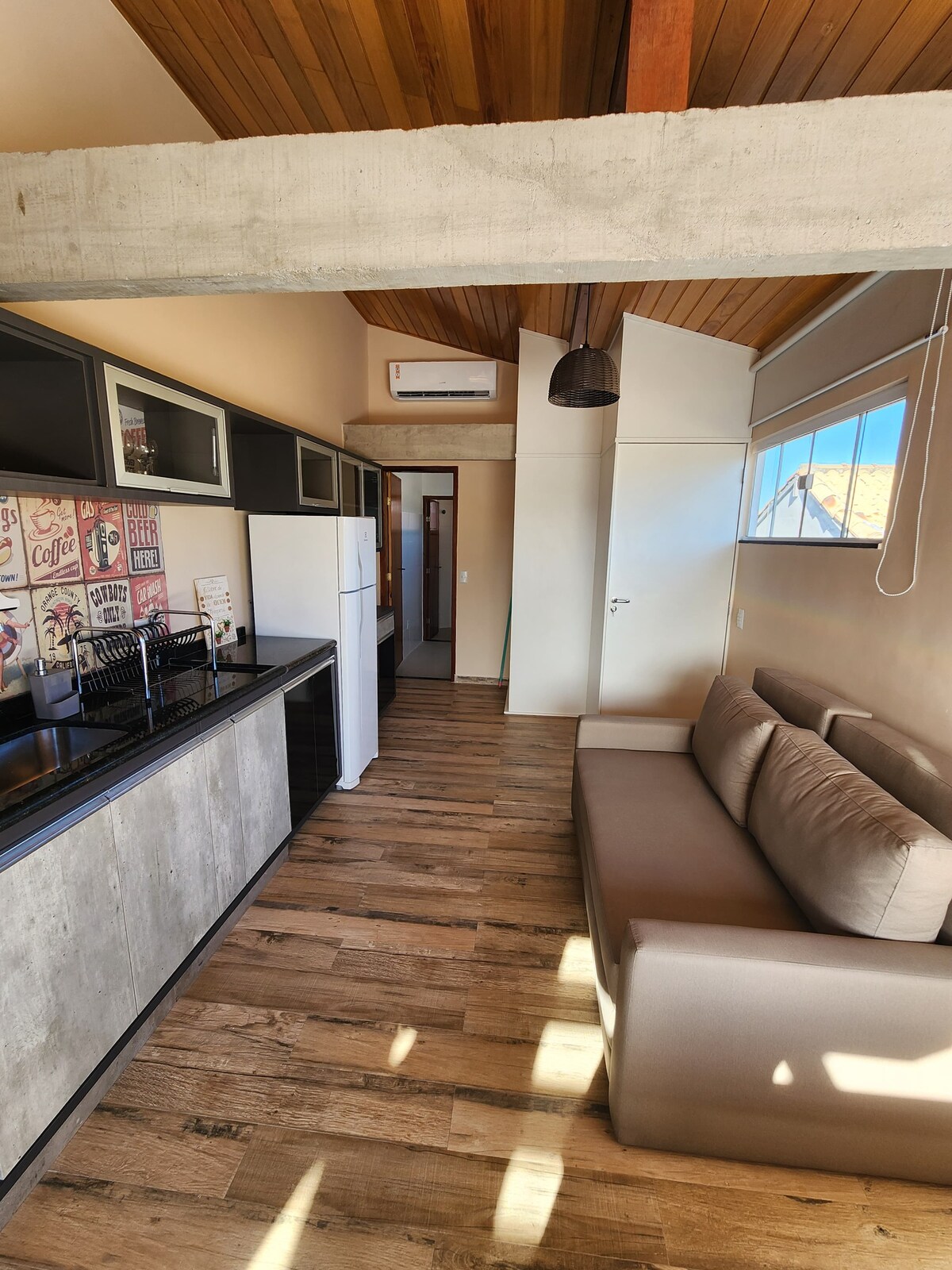 Loft decorado de forma prática para quem quer descansar e aproveitar as belezas do mar de Arraial do Cabo. Possui ar condicionado, ventiladores de teto, TV a cabo e por streaming, wifi, geladeira, cooktop, microondas, airfryer, forninho elétrico, sanduicheira, liquidificador, cafeteira, utensílios básicos de cozinha para preparo de pequenas refeições, cama de casal e um sofá cama. O prédio fica a 50 metros da Prainha. O estacionamento é rotativo e não há vagas disponíveis para todos os Lofts.