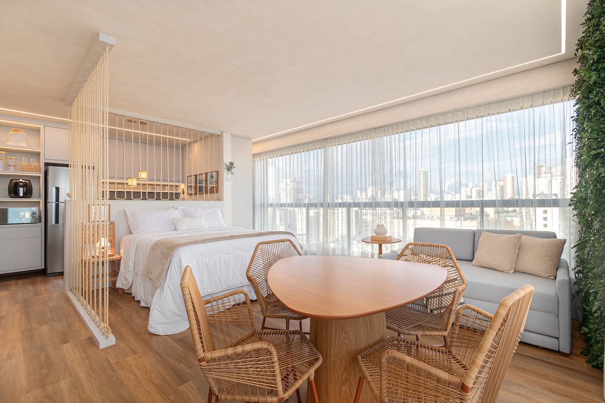 Ovaj jedinstveni smještaj ima svoj stil. Potpuno novi dvosobni stan u Bari na visokom spratu sa bioskopskim pogledom. Kuhinja i prostor s kompletnom uslugom, ormarići u svim sobama i kupatilima, potpuno klimatizovani. Zgrada sa bazenom, fitnes centrom, radnim prostorom, stalkom za bicikle, 50 metara od plaže Farol da Barra. Posmatrajte karnevalsku brvnaru i spektakularan zalazak sunca u Bahia de Todos os Santos.