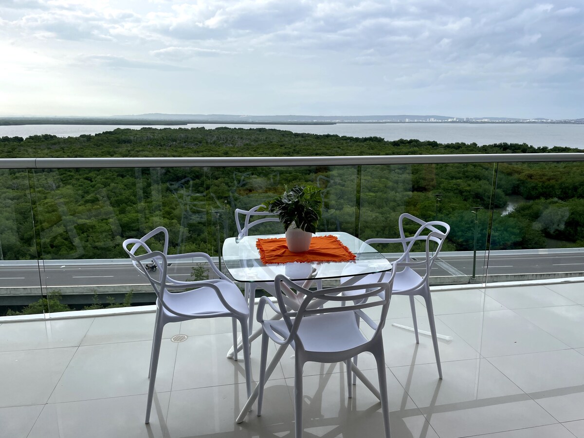 🌅Najbolji 1% Airbnb smeštaja u kompleksu Morros Epic Cartagena. Moderan dizajn uz obalu okeana za 4 osobe (bračni krevet + kauč za dve osobe). UDOBNOST: klima-uređaj, opremljena kuhinja, balkon sa pogledom na bazene i more. RAD: Wi-Fi preko optičke mreže i radni sto. Radni odmor BEZBEDNOST: Pametna brava 24/7. SADRŽAJI: 4 bazena, teretana, đakuzi, tursko kupatilo, direktan pristup plaži. RNT 241622. U blizini aerodroma i istorijskog centra. Zgrada naplaćuje naknadu za narukvicu od 20.000 COP po gostu starijem od 5 godina, po boravku.