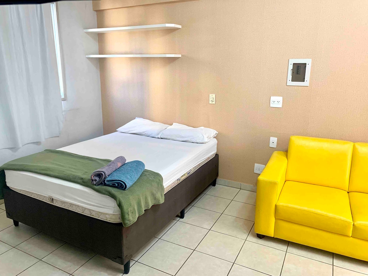 Moderan studio od 45 m² na vrhu SETORA BUENO, na T-37 sa T-63. Blizu bolnice Mater Dei, parka Vaca Brava, tržnog centra Goiânia i medicinskog centra ORION, idealno za odmor, konsultacije, preglede ili rad. U regionu se nalaze Pão de Açúcar, Oba Hortifr, pijace, apoteke, kafići i veliki izbor KUHINJE. Prostor nudi BRAČNI krevet (širine 150–179 cm), dodatni krevet, klima-uređaj, brz Wi-Fi, pametni TV i opremljenu KUHINJU, što obezbeđuje udoban, funkcionalan i prijatan boravak, savršen za različite potrebe.