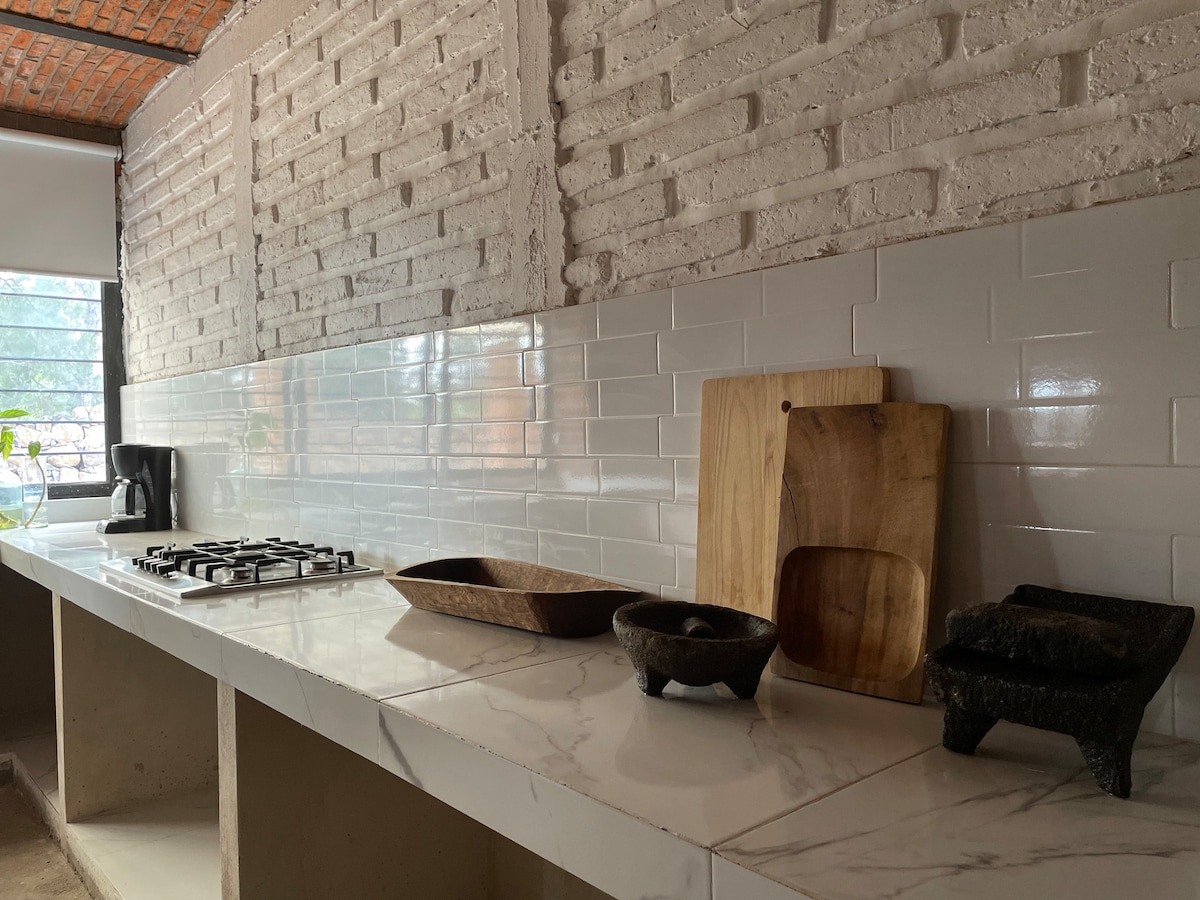 Nalazite se u rustikalnoj brvnari izgrađenoj od opeke, rezbarenog kamena i hrastovog drveta najboljeg kvaliteta, tako da je vaš boravak udoban, okružen zelenim površinama i pejzažima agave koji nas karakterišu u regionu zemlje tekile.
