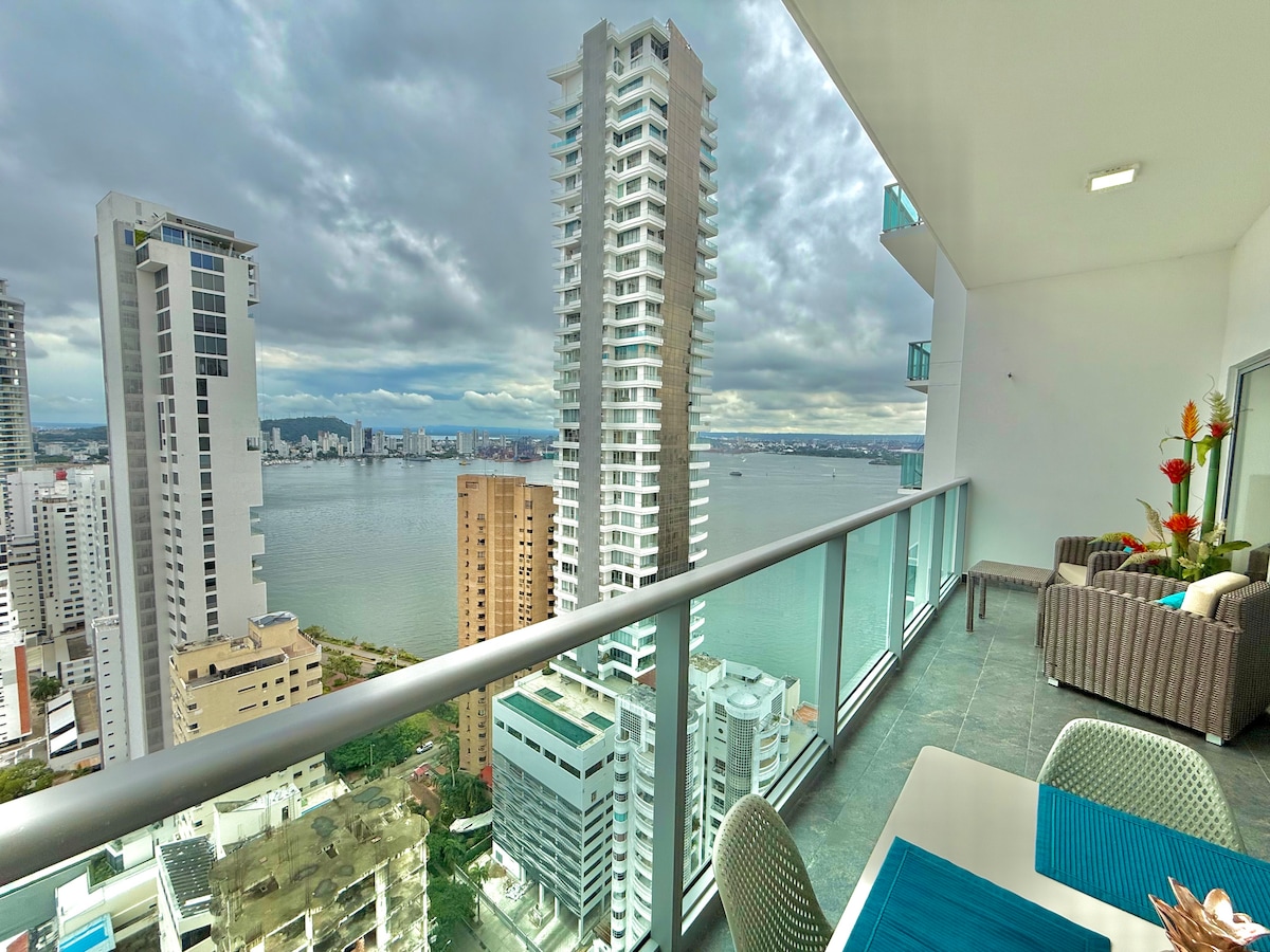 Exclusive 30th floor apartment Morros City with incredible and captivating sea and historic center views. Master bedroom with direct sea view and balcony access. Full kitchen, 2-in-1 washer and dryer, 60" Smart TV, 500MB fiber optic WiFi. Beachfront Bocagrande with luxury amenities: pool, jacuzzi, Turkish bath and gym. Free parking. Ideal for couples seeking the most exclusive experience from the highest available floor in all Cartagena