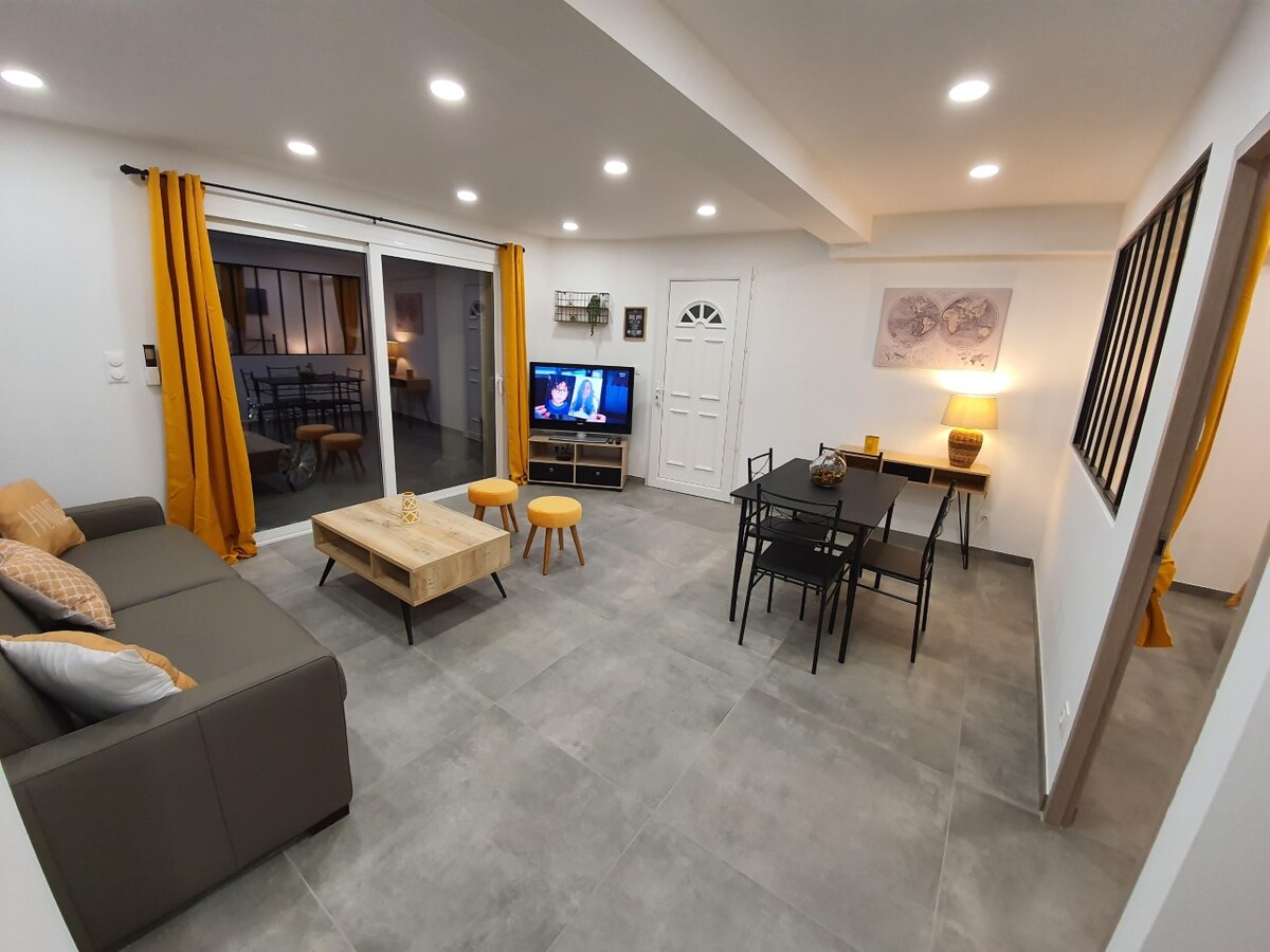 Novi smeštaj tipa F2, u podnožju vile sa pogledom na more. Opremljena kuhinja, kupatilo sa tuš kabinom, spavaća soba sa krevetom od 160 cm, dnevni boravak sa kaučem na razvlačenje, podrum sa mašinom za pranje veša, mašinom za sušenje veša i zamrzivačem. Stan ima veliku terasu sa roštiljem i pogledom na more. Blizu svih sadržaja, 150 m od supermarketa kazino i 2 minuta od plaža i centra grada.