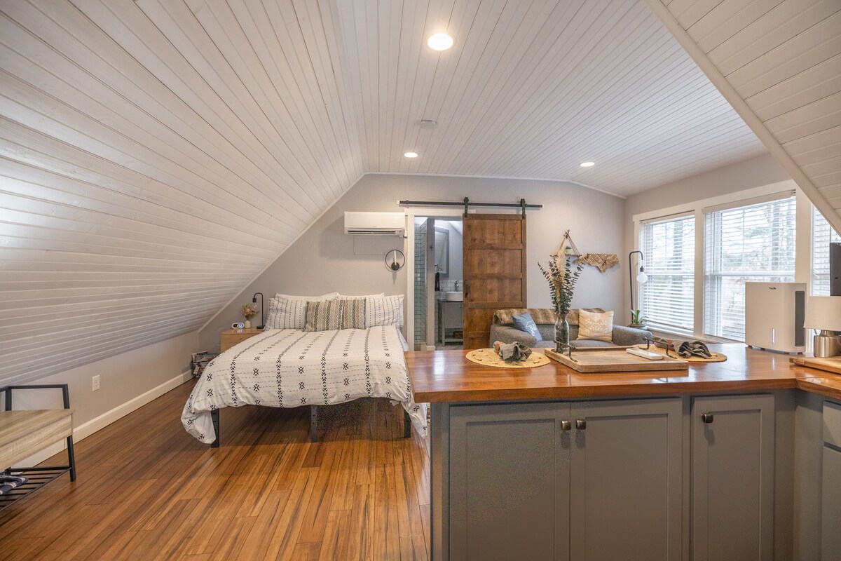 Chic Modern, Luxurious, Cozy-styled & Large private KING Bed & Barn view one-bedroom in-law apt. (1,050 sqft) w/ Fireplace. On 2 Beautiful Acres under towering trees, while only being 3 min.(1 mi) to the Biltmore Estate. 5-min. (4 mi) to the Heart of Downtown Asheville, NC; Blue Ridge Parkway, & South Slope DT breweries, coffee houses, and restaurants. Romantic, Quiet, Retreat Cottage, Nestled in Nature. A unique gem, close to it all