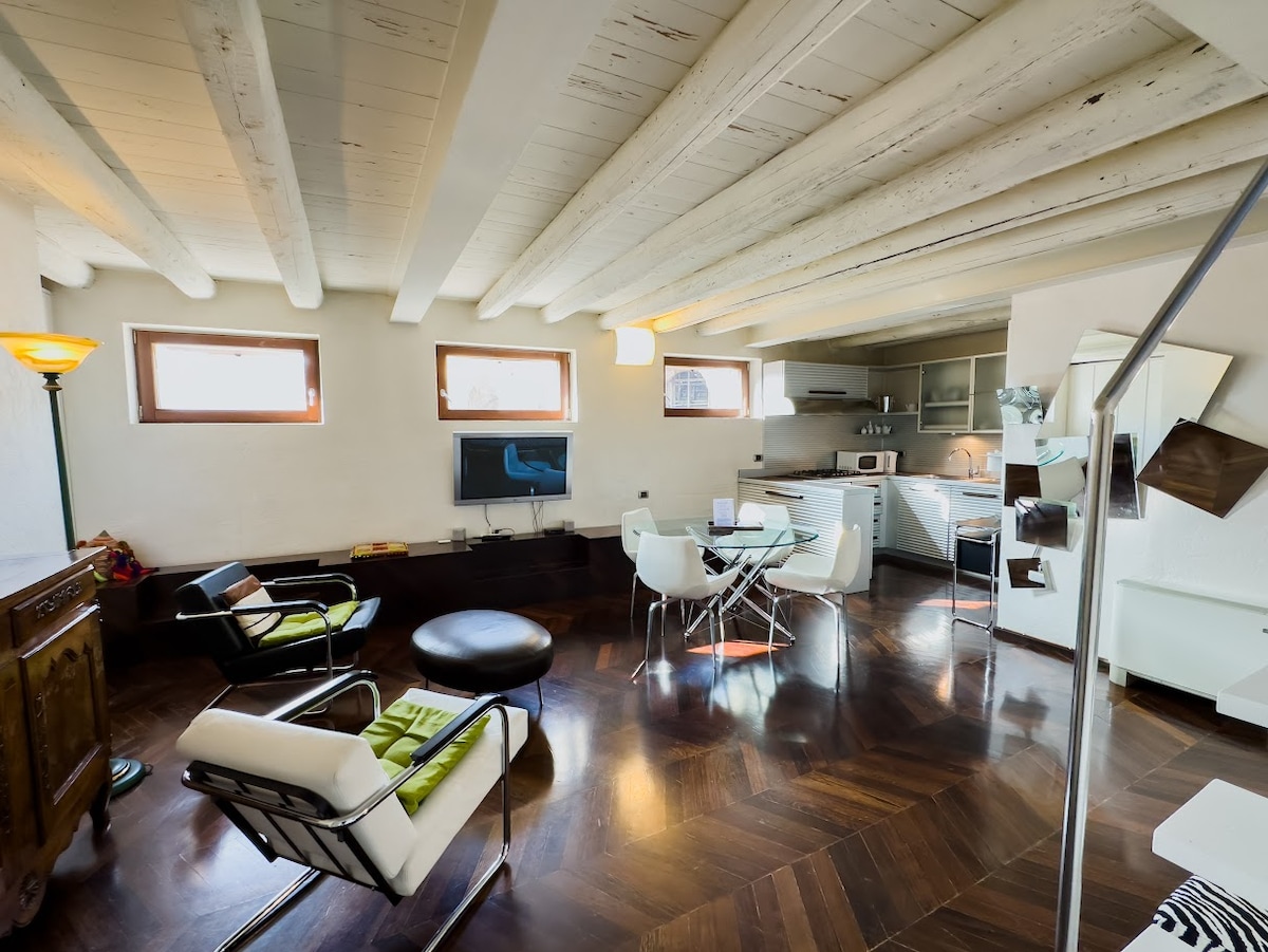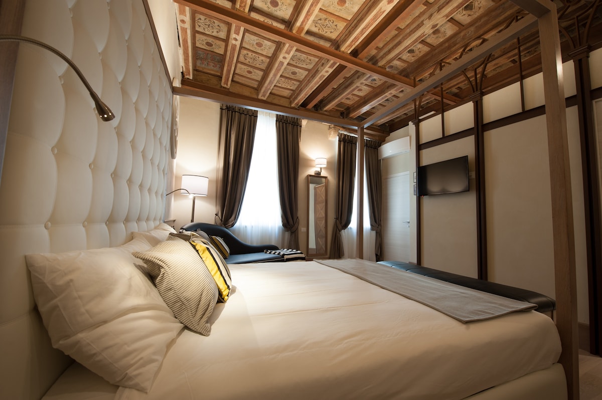 Sjajan 1 spavaća soba 1 stan u kupatilu sa 2 privatna balkona okrenuta direktno na trgu Erbe. Jedini način da u Veroni ostanete unutar istorijske znamenitosti kao pristup je isključivo kroz spomeničku „Skala dela Ragione“ ispod impresivne Tore dei L 'ti. Plafoni sa svodom su ukrašeni srednjovekovnim afreskama i drvenim gredama iz 17. veka. Potpuno opremljen i opremljen.
