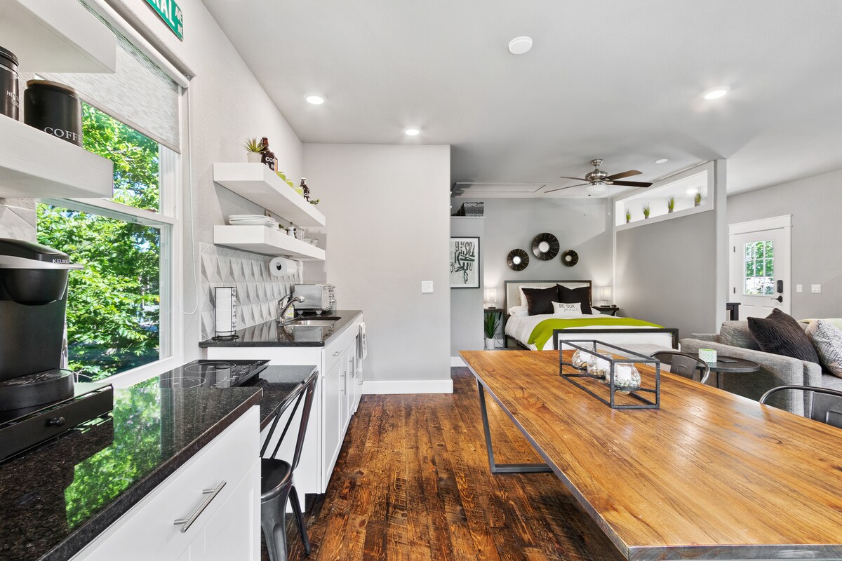 Studio A on Central – Walk to Square, Trails & Museums! Najbolja lokacija u Bentonvilu! Dobro došli u studio A na centralnoj lokaciji vaš elegantni, privatni smještaj samo nekoliko koraka od centra Bentonvila, ovaj predivno uređeni stan u garaži nudi nenadmašan pristup trgu Bentonvil, Kristal Bridžisu (slikovitih 5 minuta hoda!), stazama svjetske klase, živopisnim restoranima i butik kupovini. Bez obzira na to da li ste tu da jašete, istražujete ili se opustite, Studio A je savršena baza.