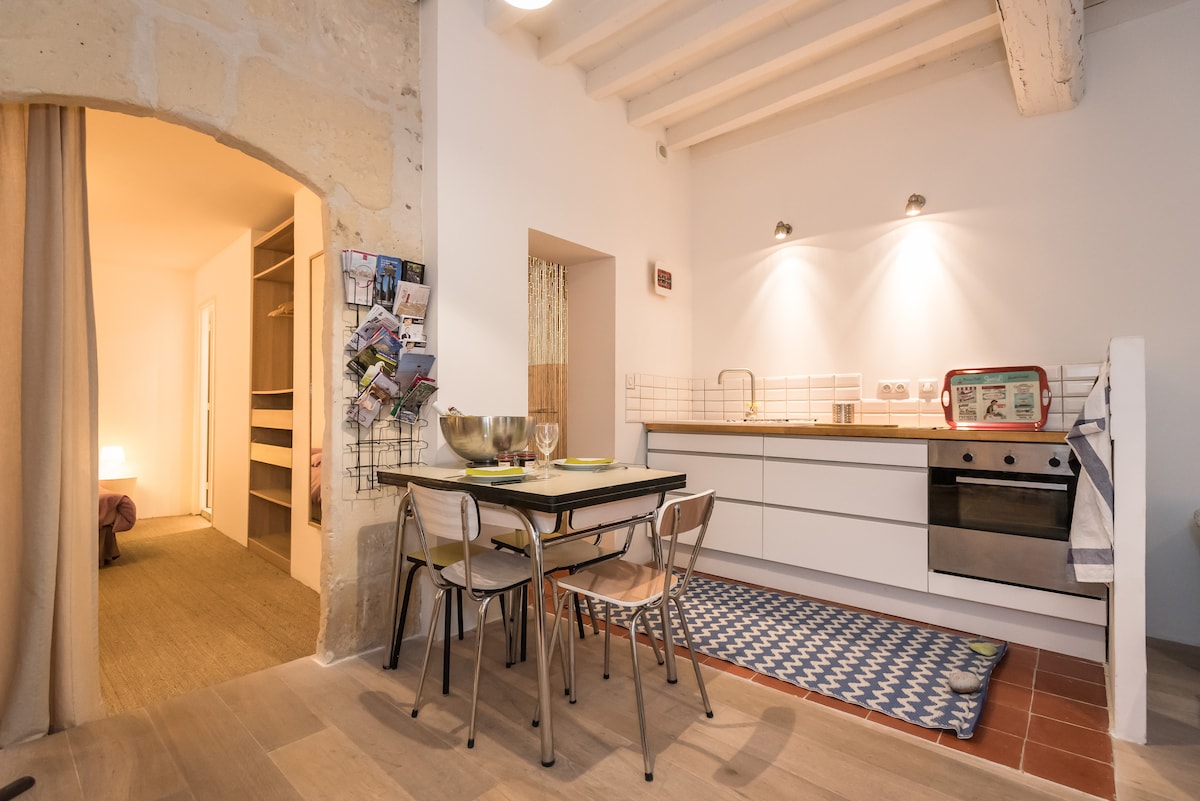 Suite à un commentaire désagréable, je tiens à préciser que comme le dit le titre de l'annonce, le studio est tout petit. Si vous voulez plus de place, j'ai un 2 piéces juste à coté pour à peine plus cher. Mini studio équipé: vaisselle, ustensiles de cuisine, nespresso, draps etc Internet petite terrasse. Parking privé gratuit ( 24h de parking sur Arles: 19.7€) Climatisation réversible, cuisine 2 plaques four frigo Mezzanine avec un lit en 140 lieu très calme à 10 minutes à pied du centre.