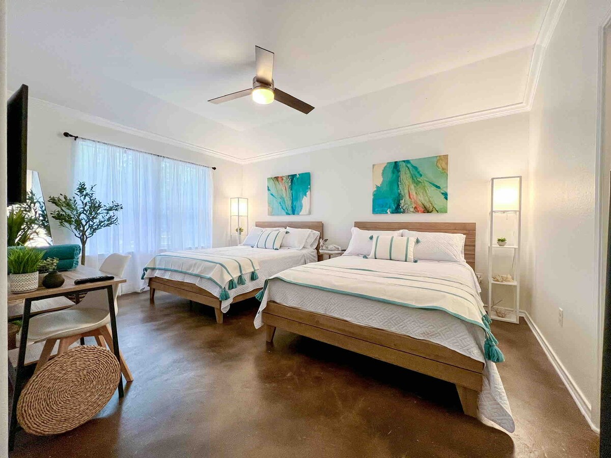 Profesionalno očišćeno po visokim standardima, uključujući kvake na vratima i prekidače za svetlo. Boravite u svojoj „galeriji“ na samo nekoliko minuta hoda od restorana i prodavnica u Bishop Arts! Nedavno je renoviran i sada ima udobne krevete, kuhinju sa plinskim šporetom i granitnim radnim površinama, dnevni boravak sa 55-inčnim pametnim TV-om i moderno kupatilo sa tuš-kabinom u ravnini poda. Sva umetnička dela su originali lokalnih umetnika i mogu se kupiti – ponesite deo Dalasa sa sobom!