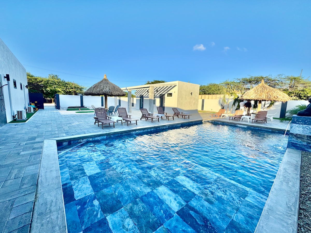 Ova zapanjujuća vila sa 4 spavaće sobe i WC-om nudi vrhunski odmor na Arubi, udaljenu 5 minuta hoda od netaknutih plaža na ostrvu. Opustite se u prostranoj udobnosti dok svjedočite veličanstvenom, neometanom pogledu na zalazak sunca iz privatnog bazena i prostora za opuštanje. Svaka spavaća soba se može pohvaliti privatnim kupatilima i udobnim bračnim krevetima, što svima obezbjeđuje miran boravak. neka uspomene u ovom jedinstvenom smještaju prikladnom za porodice. Svaka soba ima sopstveni izlaz na otvoreno.