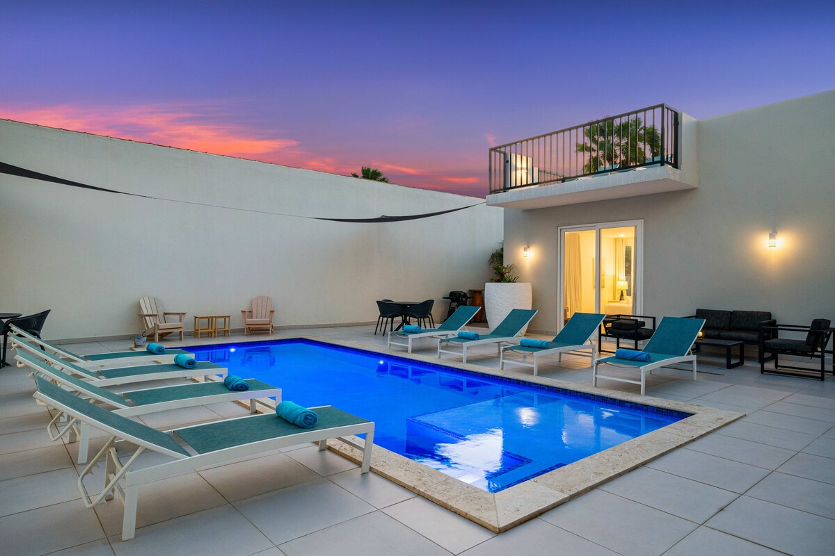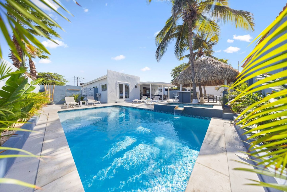 Lokacija, lokacija !! Dobrodošli u Summer Wind Villa! Manje od 5 minuta hoda do srca Palm Biča, ovaj prostrani dvospratni smještaj 6BR dizajniran je za okupljanje, opuštanje i stvaranje uspomena. Uživajte u svim bračnim krevetima, pametnim televizorima, privatnim balkonima i 2 spavaće sobe pored bazena. Vrhunac je prostrano privatno dvorište sa blistavim bazenom dubine 4,5 stopa, ležaljkama za sunčanje, barom na otvorenom, ljuljačkama i igrama. Klima-uređaj, topla voda, Wi-Fi i dovoljno prostora za povezivanje, to je savršeno mjesto za vaš odmor na Arubi.
