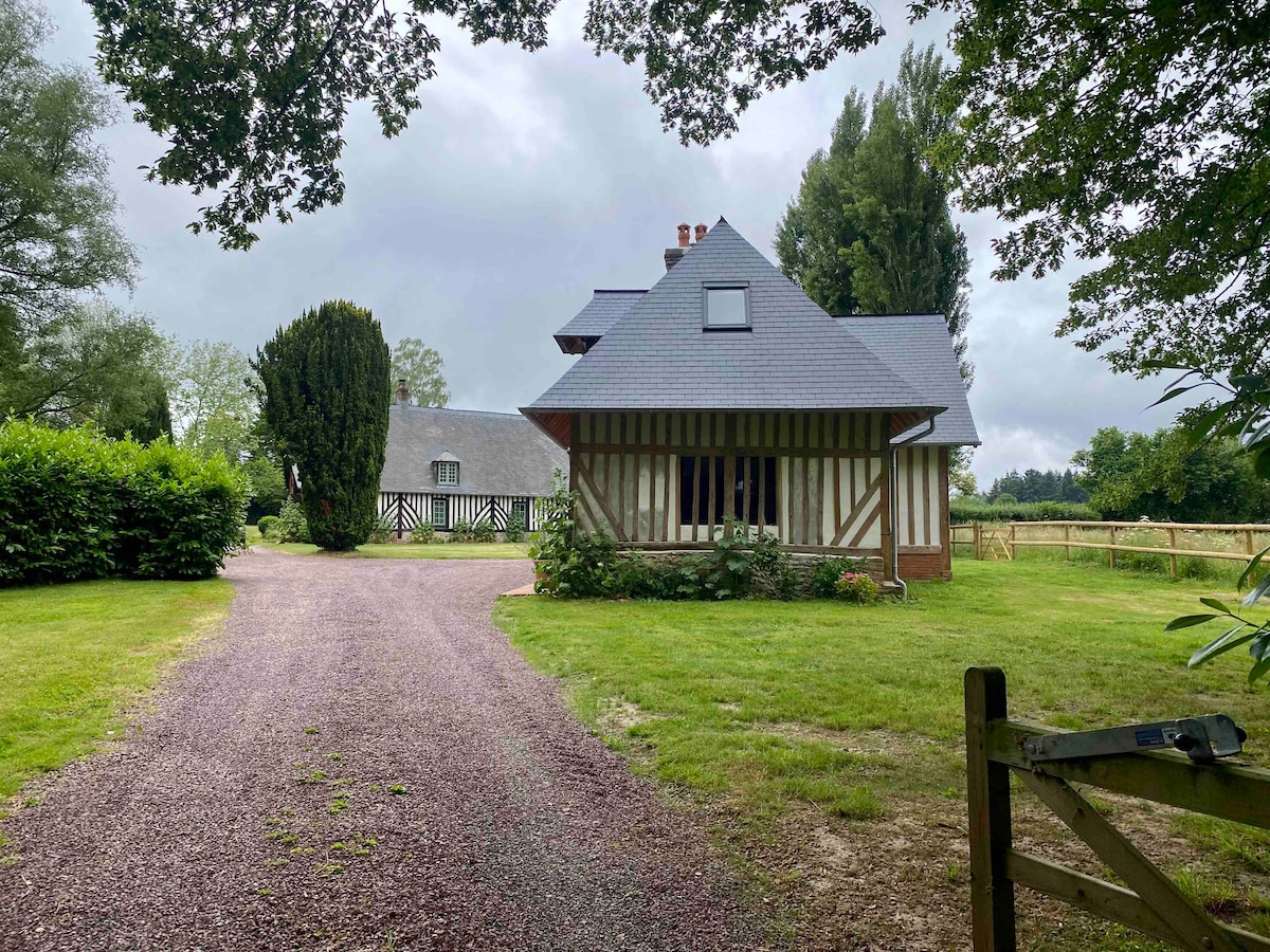 Maison indépendante de 120 m2 habitables et son jardin privatif et clos de 2000m2 pouvant accueillir jusqu'à 8 personnes et un bébé. Au calme, idéal pour les amoureux de la nature (point de départ de belles balades à travers la campagne ou en forêt, à pied ou en vélo/moto) et les familles (nombreux jeux dehors et dedans) mais aussi à 35 min de la mer -Deauville, Trouville, Honfleur. Dans le parc mitoyen vous pourrez donner à donner à manger aux moutons.
