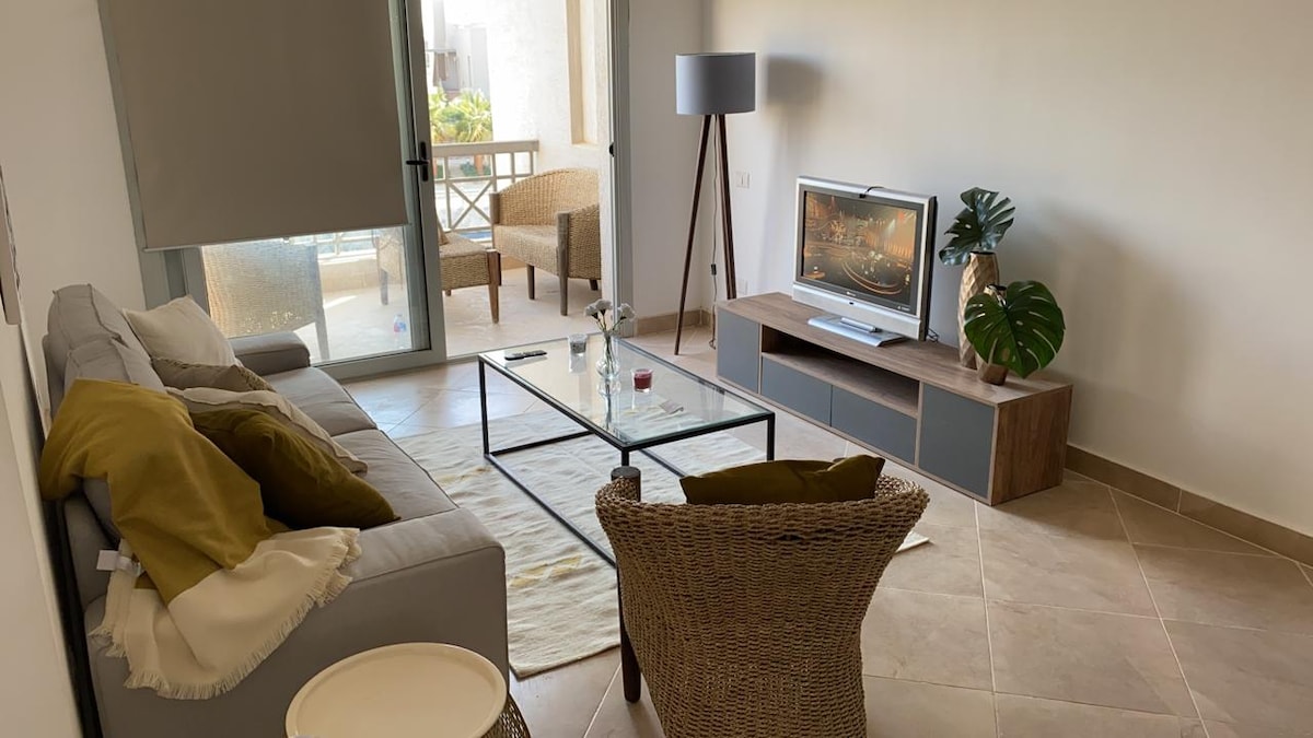 Kick back and relax in this calm, stylish 2 bedroom seaside vacation apartment. Complete with all the amenities needed. Located in the most popular, well-kept beach residential resort, Ein Bay, on the Red Sea. Guests have access to a private rooftop where they can enjoy a BBQ or simply gaze at the stars with a sip of their favorite drink.