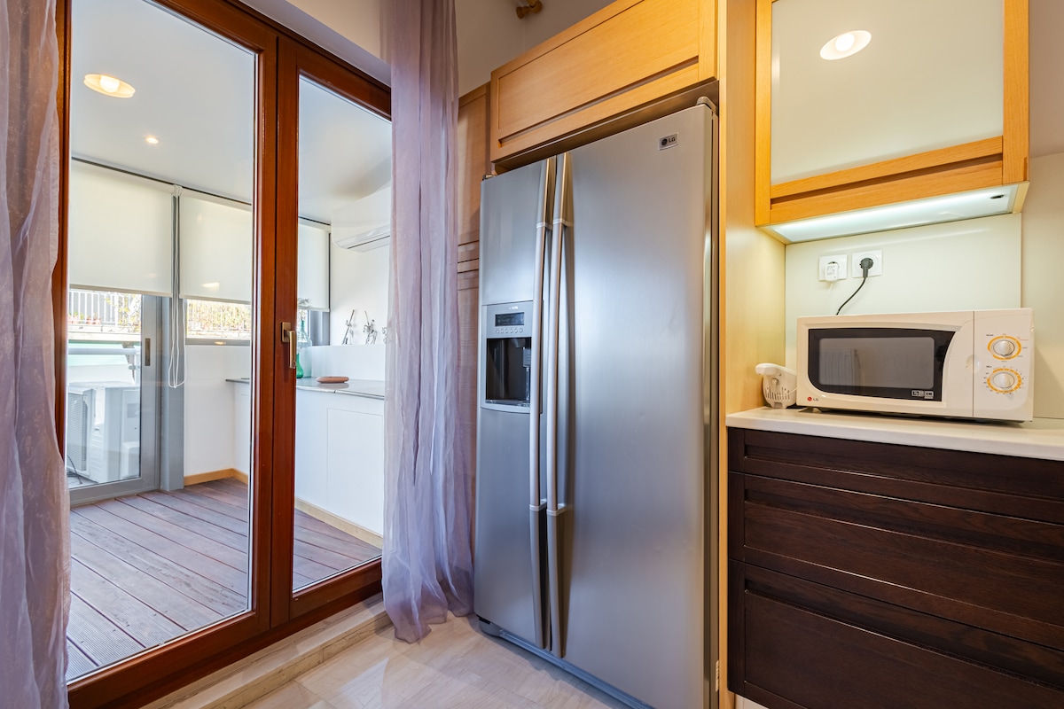 Located in Athens center, you can sunbathe & relax in your private terace overviewing Athens ( & a glimpse of Acropolis). 2min by foot from Kerameikos metro & 18min from Acropolis. Direct airport & center connection. In a small street, 4th floor, 38m2, with 40m2 balcony. Quiet but in the heart of a vibrant area, full of taverns & coffeeshops. There are steps to climb. Following the padestrian route, you arrive at the Acropolis through the famous streets of Monastiraki &Thision. No elevator