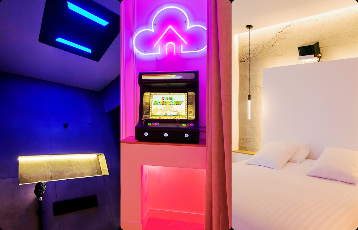 The Cloud, suite de luxe au cœur de Troyes ! Offrez-vous une nuit hors du temps dans une bulle de confort, de design et de sensations. - Lit King Size 5* pour flotter comme Sangoku sur son stratus - Douche sensorielle en Duo - Borne d’arcade avec 8000 jeux - Cinéma 4K immersif - même en journée ! - Balançoire suspendue vue sur les arbres - Canapé nuage sublimé par une aurore boréale LED Réservez votre escapade céleste et laissez-vous porter par les nuages
